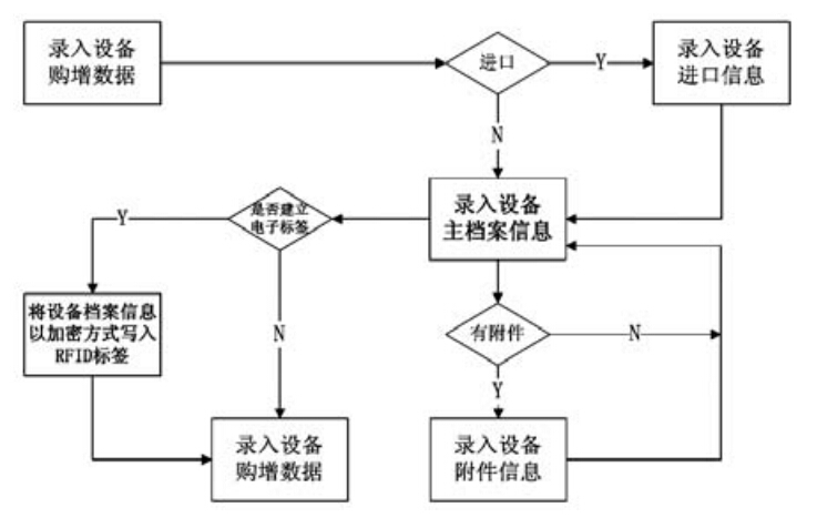 如图 2 所示,在医院设备购增流程中,不仅建立每个设备电子档案信息, 而且以加密方式将设备档案电子信息写入到其对应的 RFID标签中。