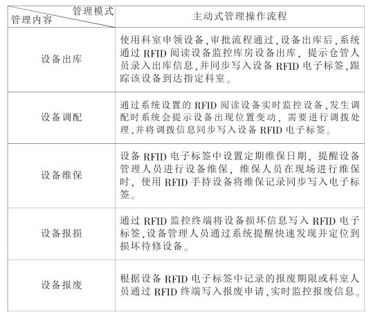 设备全周期管理最重要环节,包括设备出库、调配、附件耗用、维保记录与报废处理等多个管理流程,基于物联网技术的医院设备管理系统具有主动式管理功能,其各管理操作流程描述如表 1 所示: