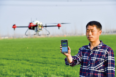 在河南省驻马店市遂平县常庄镇大兴村,无人机植保员徐伟在展示操控植保无人机的手机软件操作页面(3月13日摄)。春耕备耕时节,中原大地农事繁忙。植保无人机、电动平移喷灌机等智能设备开始应用到农业生产,助力农民春季麦田管理。